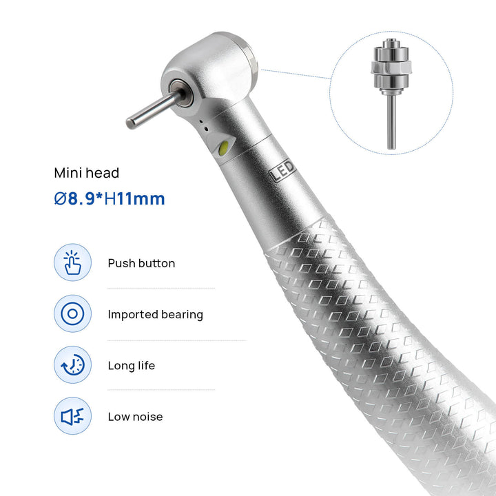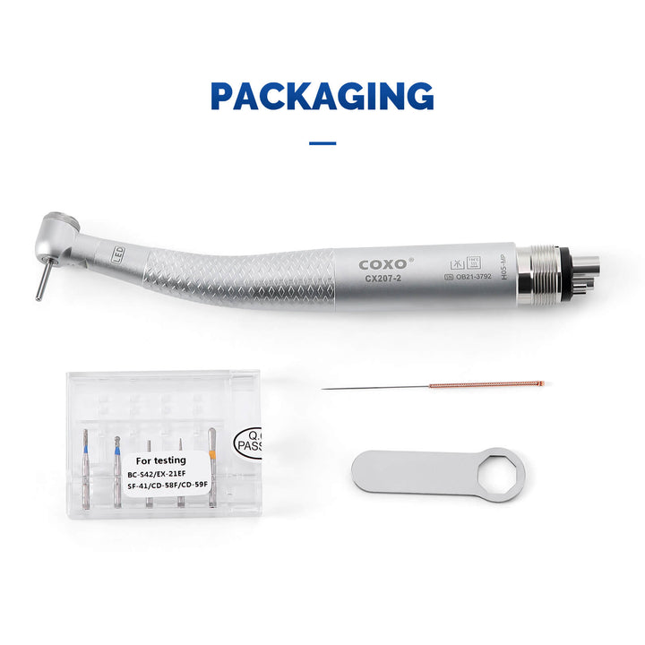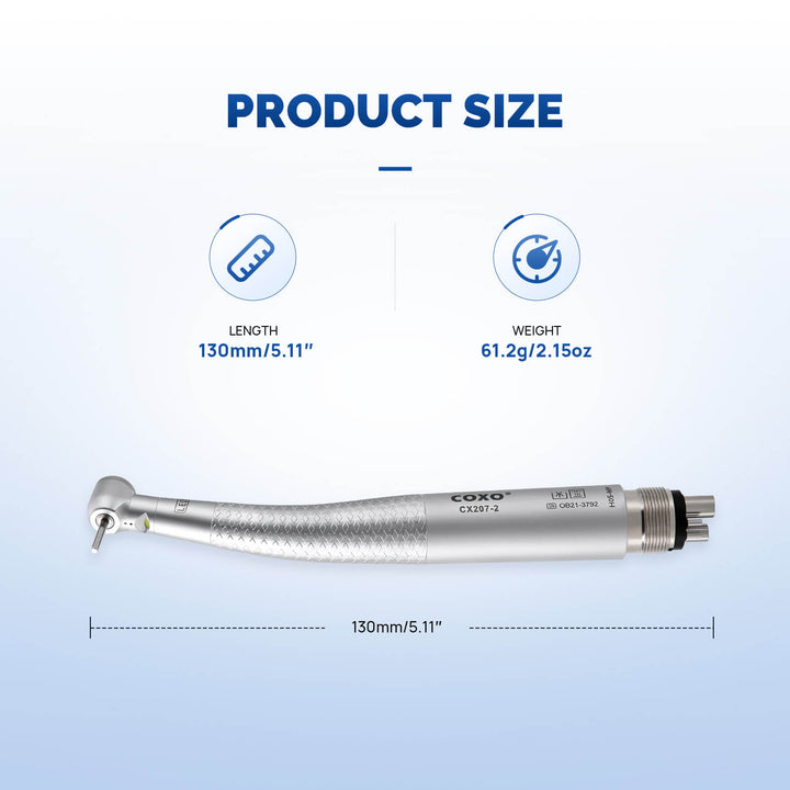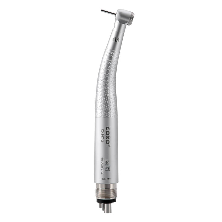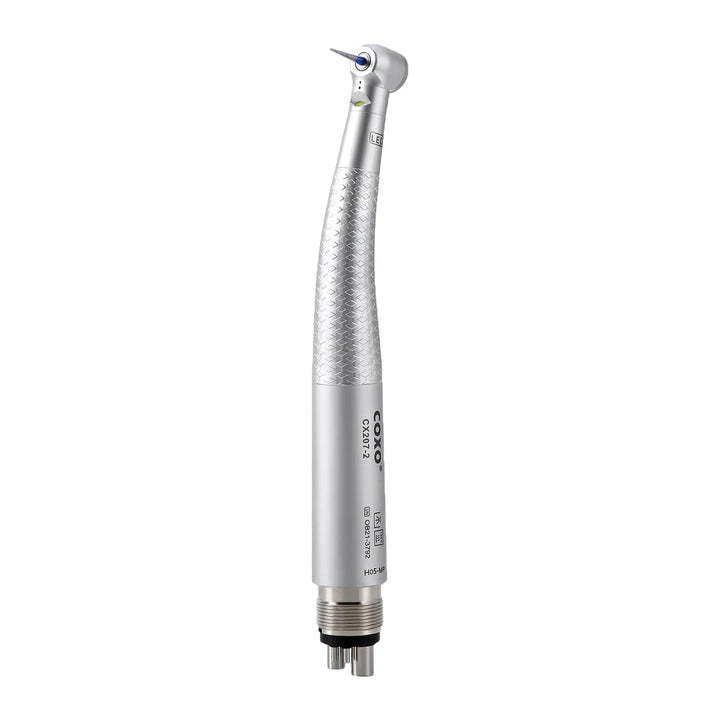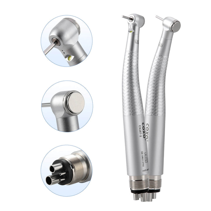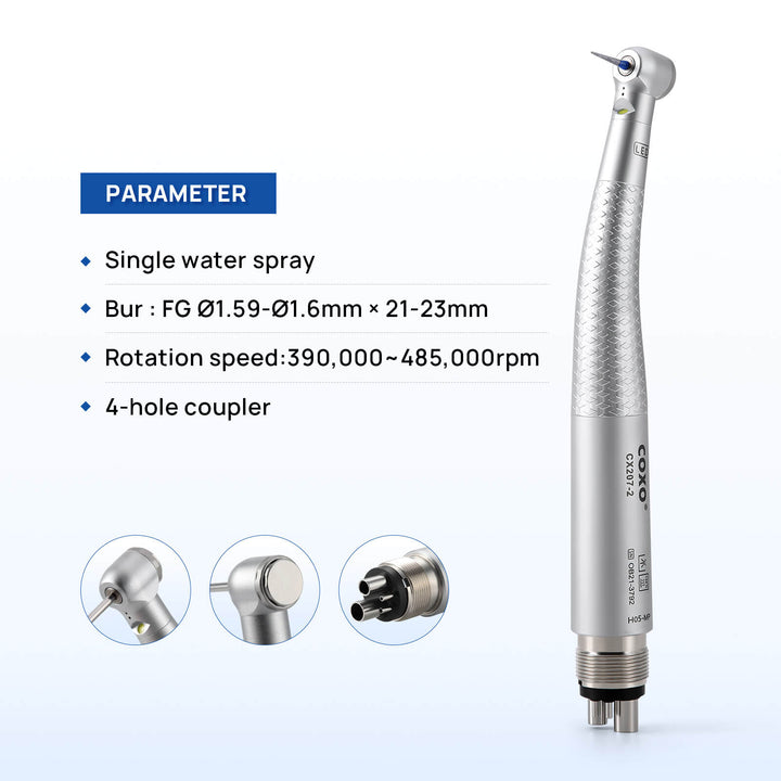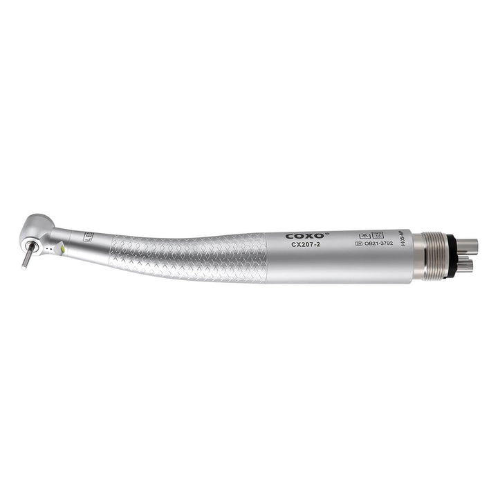 COXO CX207-2 LED High-speed Air Turbine Handpiece with Generator Mini Head 4 Holes Coupler #H05-MP4. Mini head, 1-port spray, Push button. With LED, self-illumination, long service life up to 10000 hours, brilliant illumination, give you better vision.High cooling effect, unique spray angle,can accurately cover the tip of the bur. Powerful cutting ability. Imported bearing, long life, low noise, and stable, balanced impeller.