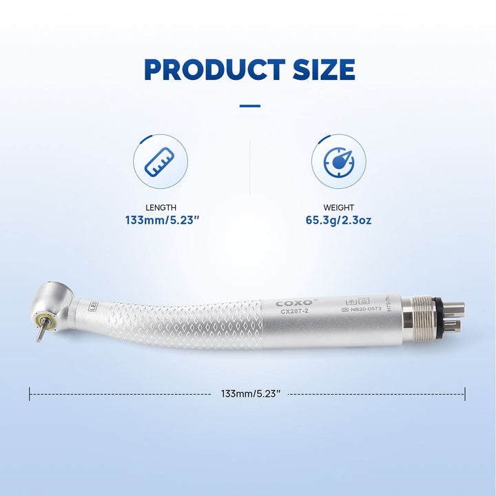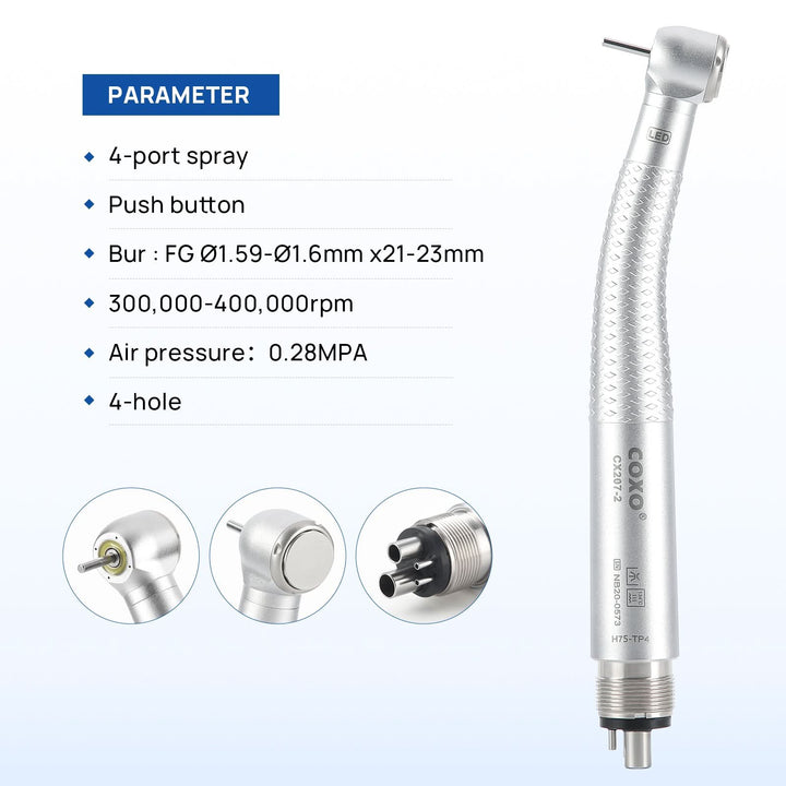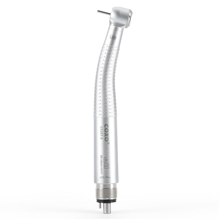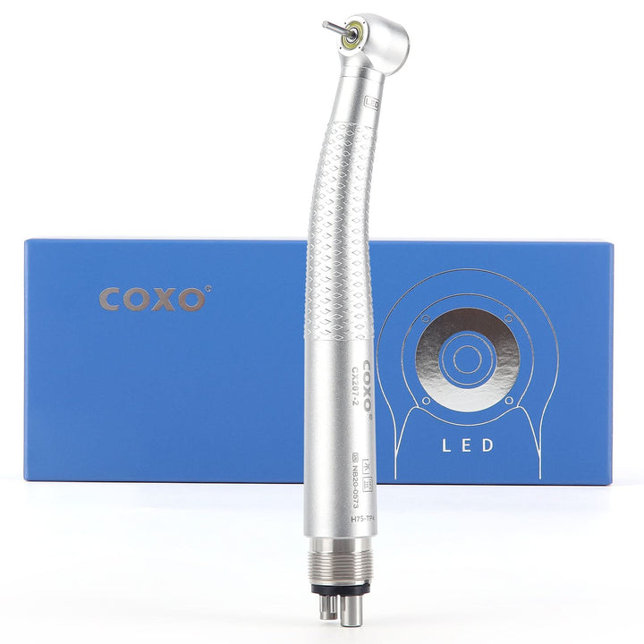 COXO CX207-2 Shadowless LED High Speed Air Turbine Handpiece with Generator Torque Head 4 Holes Coupler #H75-TP4. Powerful cutting ability. Shadowless Led, handpiece with generator, brilliant illumination, give you better vision. High cooling effect, unique spray angle, can accurately cover the tip of the bur, complete head made by CNC, more stable. Stainless steel bearing, long life, low noise, and stable. Balanced impeller, cartridge passed the Germany dynamic balance machine test.