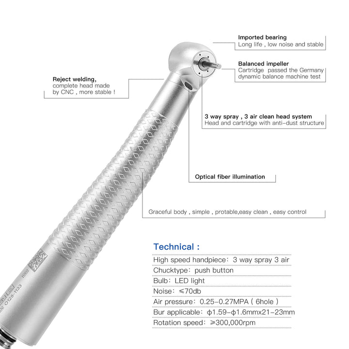 COXO CX207-G Fiber-optic High-speed Air Turbine Handpiece,≥300,000rpm,Standard Head,3-port spray, #H16-NSPQ.
