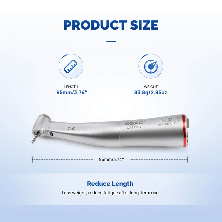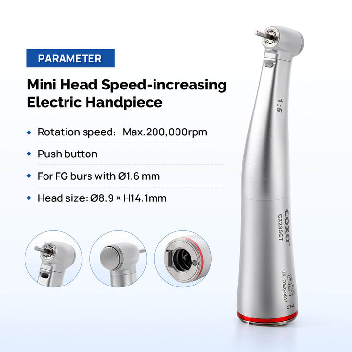 COXO CX235C7 1:5 Speed Increased Contra Angle, Inner Channel, With Fiber Optic, Max 200, 000rpm, Mini Head, Push Button, For FG burs Ø1.6mm.# C7-4