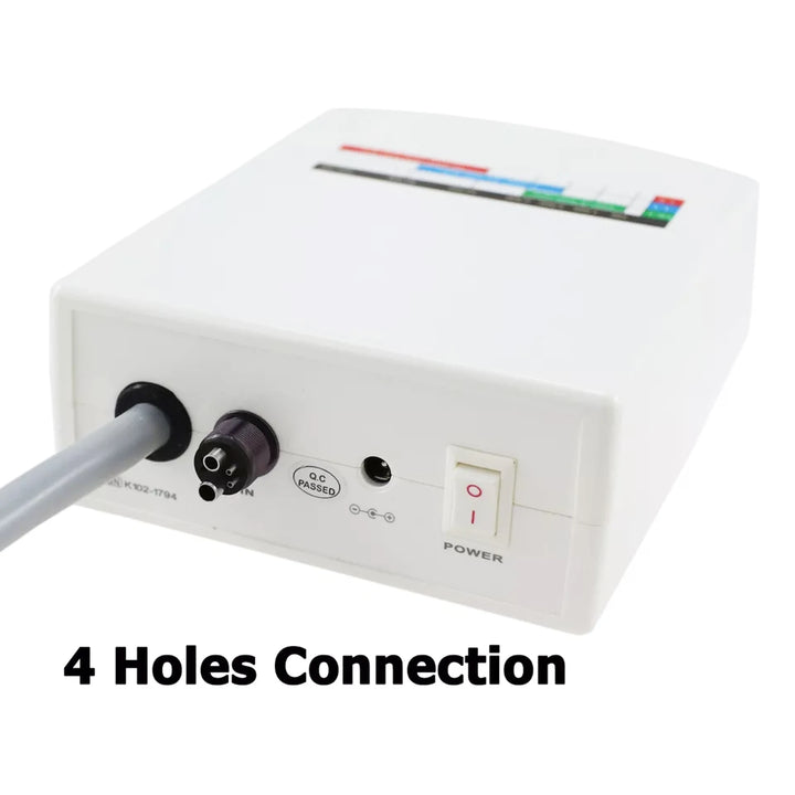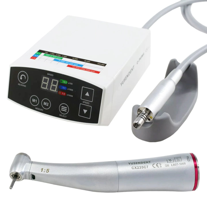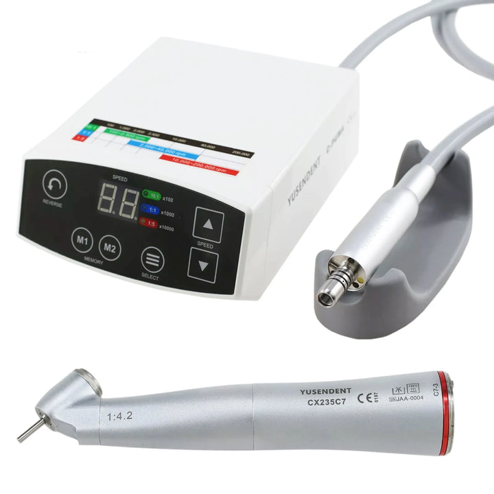 Motor handpiece: Compact and handy ; Ergonomically designed length and weight greatly reduce the fatigue from long time operation, but it is as powerful as the current brushless clinical micromotors and offers the same speed range, thus enabling practitioners use contra-angles and micromotors just like the use of air turbines.
