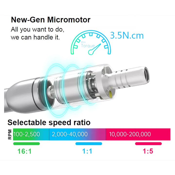 Combined with a wide range of contra-angles and straight handpiece, it covers a speed range of 100-200,000 min-1, to make it suitable for any applications.