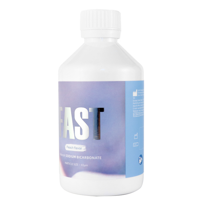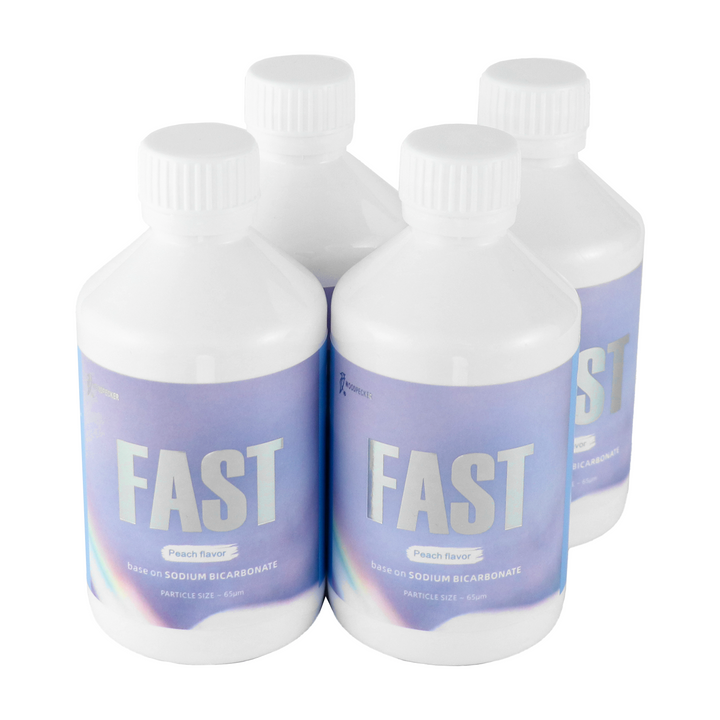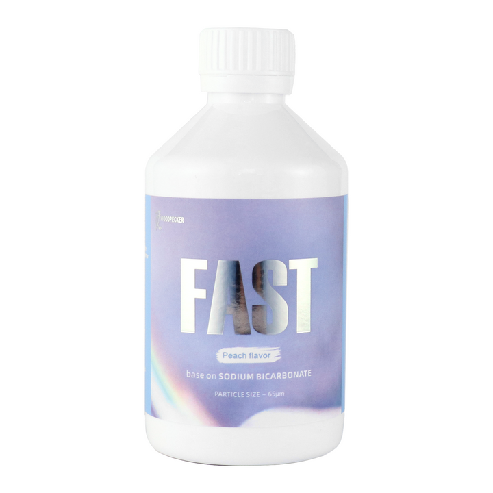 Woodpecker Prophy Air Polisher Prophylaxis Powder 65um Sodium Bicarbonate for Supragingival Scaling #FAST 4 Bottle/Unit. Used for rapid removal of stubborn pigment, soft dirt and biofilm on the adult gingival. 2.5 Mohs' hardness, Provides efficient and rapid removal of stubborn pigment, soft dirt and biofilm on adult gingival.