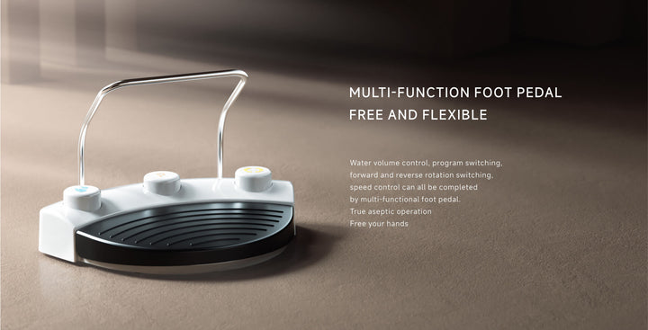 Multi-Function Foot Pedal The Woodpecker Implant Air Implant Motor foot pedal has 1) water volume control 2) program switching 3) forward and reverse and 4) speed control. This allows you to free your hands and focus on the implant procedure.