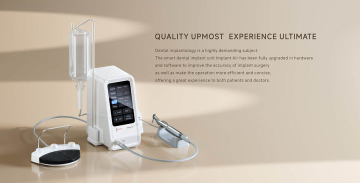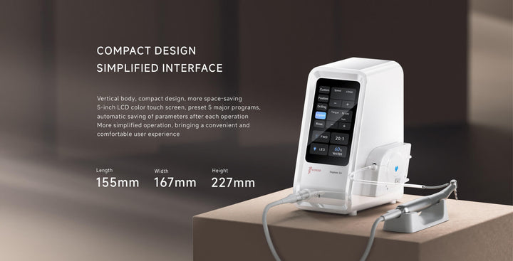 Compact Design & User Friendly Interface The Implant Air Implant Motor is designed with space savings in mind. Its compact design is perfect for space savings in your operatory and has a much smaller foot print than other implant motors available. This is not your typical “clunky" implant motor. -Length 6.1 inches (155mm) -Width 6.5 inches (167mm) -Height 8.9 inches (227mm) The 5 inch color LCD touchscreen is user friendly and easy to understand. It has 5 pre-set surgical programs and automatically saves the parameters after each operation.