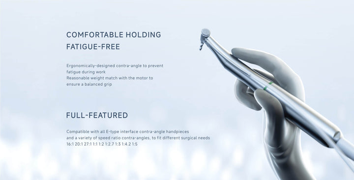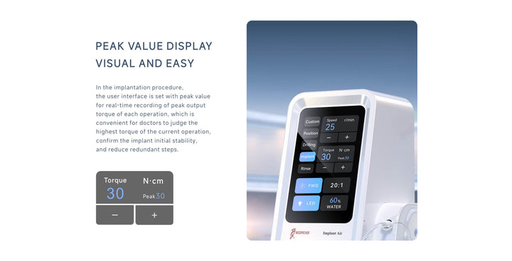 The Implant Air Implant Motor features automatic torque calibration upon powering on the motor to ensure absolute accuracy and eliminating manual operational steps.