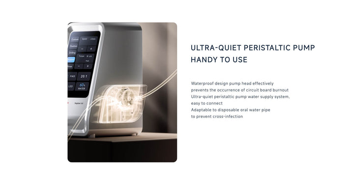 Ultra Quiet Peristaltic Pump that is Convenient to Use The Implant Motor water pump has a waterproof design to prevent any occurrence of circuit board burnout. Simple and user friendly connect for water supply and is adaptable to using a disposable water source.