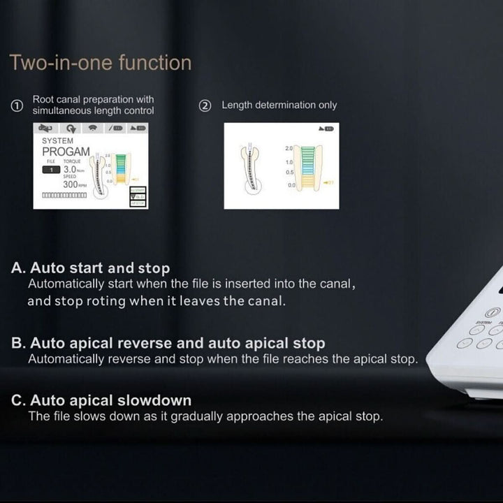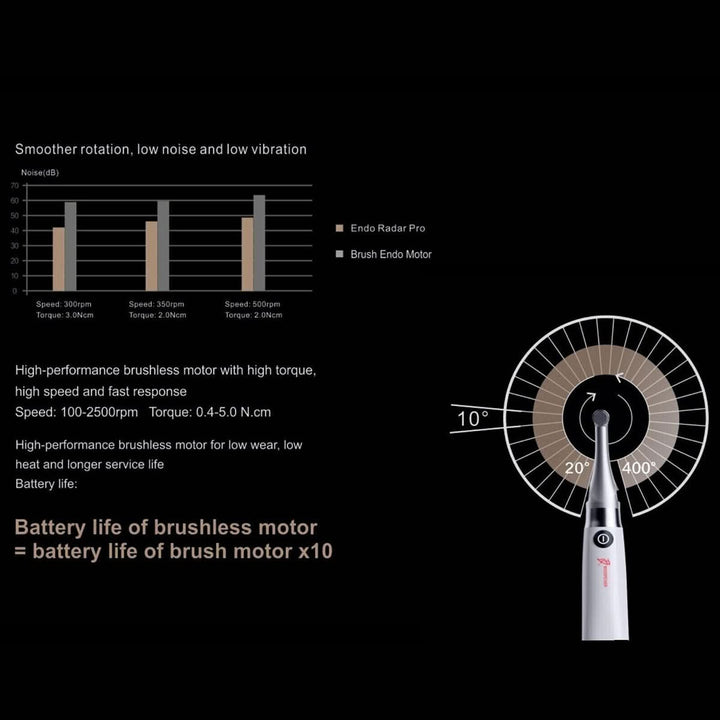 - High-performance Brushless Endo Motor. Super high torque, high speed, lower noise, fast response, more accurate output, and more stable, ensuring more efficient & safe preparation.