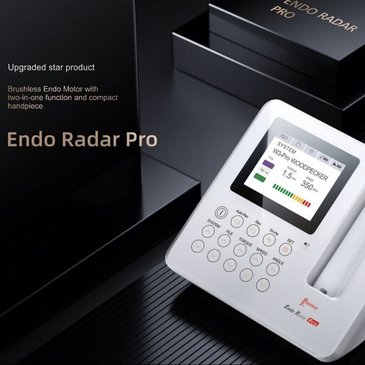 Woodpecker Endo Radar Pro. Endo Motor with Apex Locator. Two-in-one function. Ultra-compact and cordless handpiece enables better hand feeling. 6:1 speed ratio. 360°rotatable handpiece. FDA Approved. One Year Warranty.