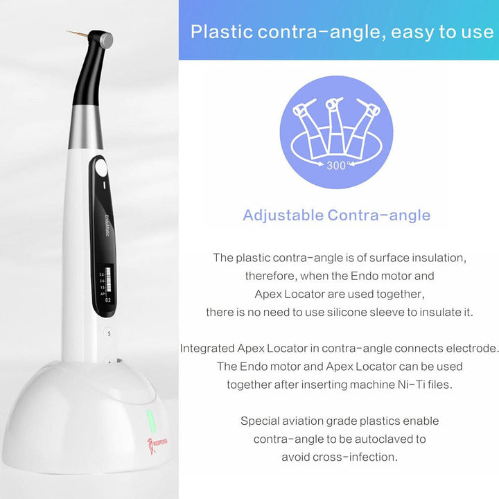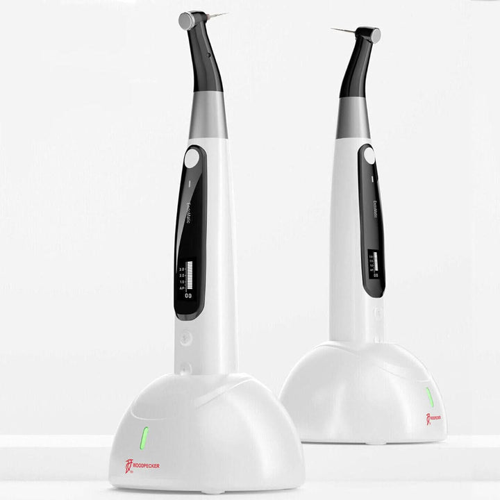 Woodpecker EndoMatic Cordless Endo Motor Built-in Apex Locator, 2 in1 Endo System Insulated Plastic Contra-angle without Using Silicone Sleeves. 300° Rotatable Contra-angle. Length Determination. Auto Start and Stop & Auto Reverse and Stop & Auto Apical Slow-down. All-Angle OLED Screen. Built-in 20+ file systems. Wireless Charging. Endodontic Root Canal Measurement and Treatment. One Year Warranty.