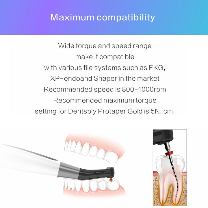 Built-in 20+ file systems, wide speed and torque range make EndoMatic compatable with most file system such as FKG, Dentsply, Edge Endo, Vakker etc on the market.