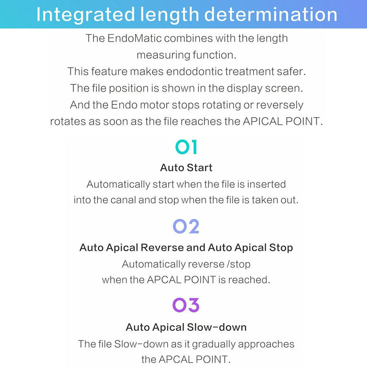 This length measuring fuction make the endo treatment safer. The OLED screen shows the file position in real-time. The motor will gradually slow-down when approach the apical point and will stop roatate or reversely roate when the file reach the apical point.