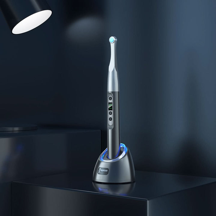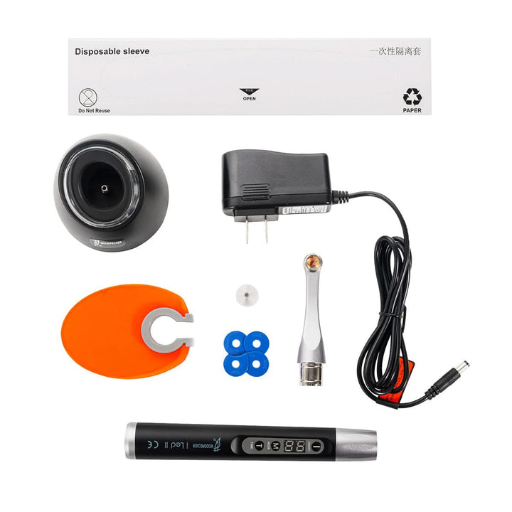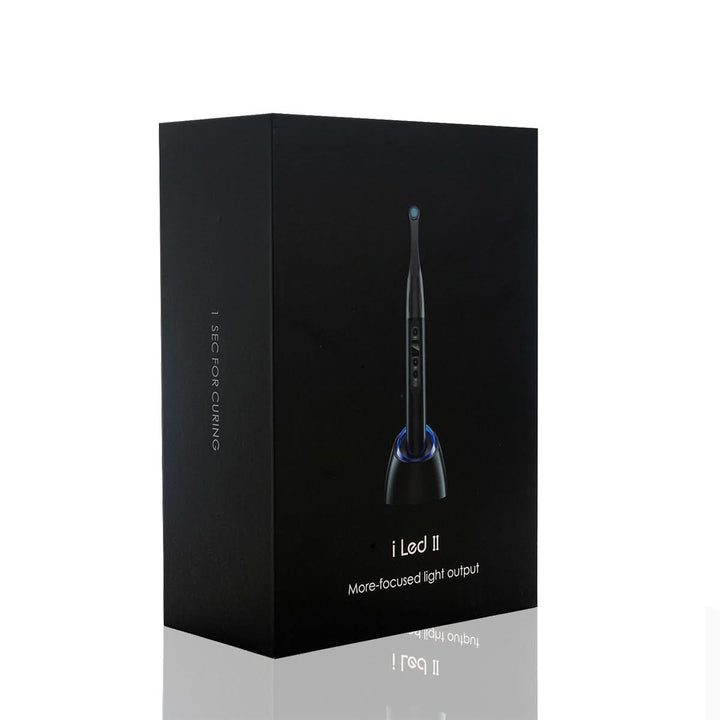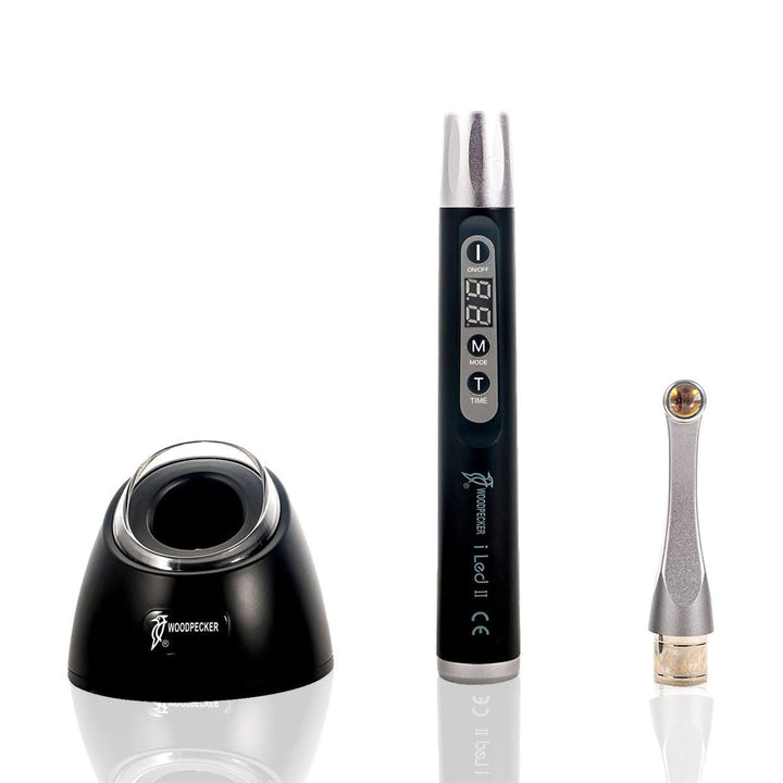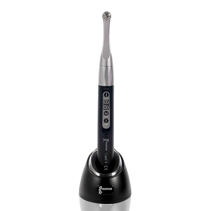 Woodpecker ILED II Curing Light. Black Color. Wireless 360° Rotary. 1 Second Curing 2mm Reins. Upgraded Focused Light 3000mW/cm2. Metal Head. Upgraded Wide Spectrum (385nm-515nm). 8-10mm Illumination Range. High Light Intensity Focused Light. Ergonomics Fluid Design. Three Working Modes. 2000mAh Rechargeable Lithium Battery, FDA Approved. One Year Warranty.